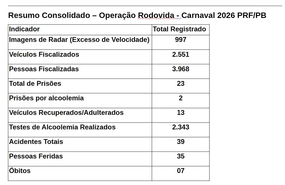 Resumo Consolidado – Operação Rodovida – Carnaval 2026 PRF/PB