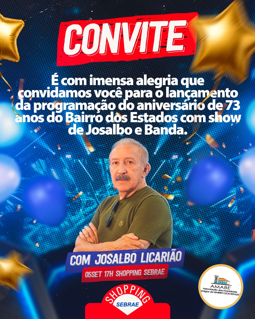 A PROGRAMAÇÃO DO ANIVERSÁRIO DE 73 ANOS DO BAIRRO DOS ESTADOS TEM INÍCIO NESTA SEXTA FEIRA, DIA 5 DE SETEMBRO, A PARTIR DAS 17H NO SHOPPING SEBRAE, COM SHOW DE JOSALBO LICARIÃO E BANDA
